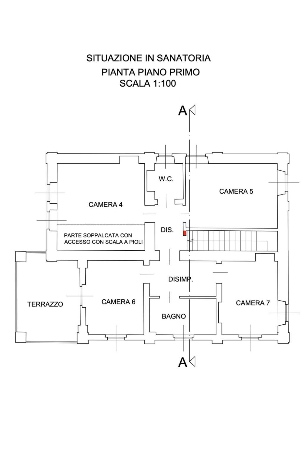 Primo piano (circa 125 mq): disimpegno, quattro camere da letto (di cui una con soppalco), due bagni e un grande terrazzo con vista aperta sul verde circostante.