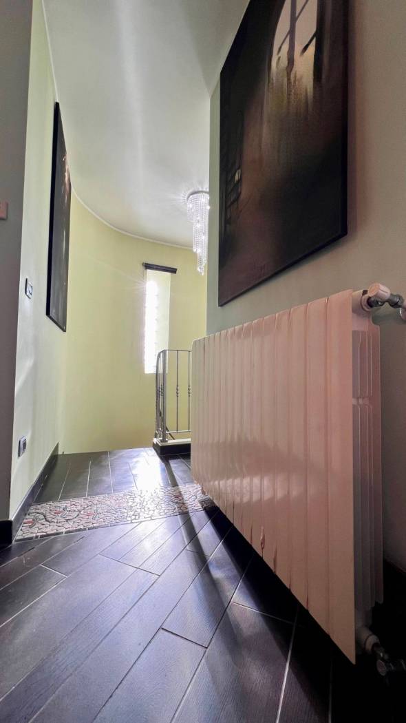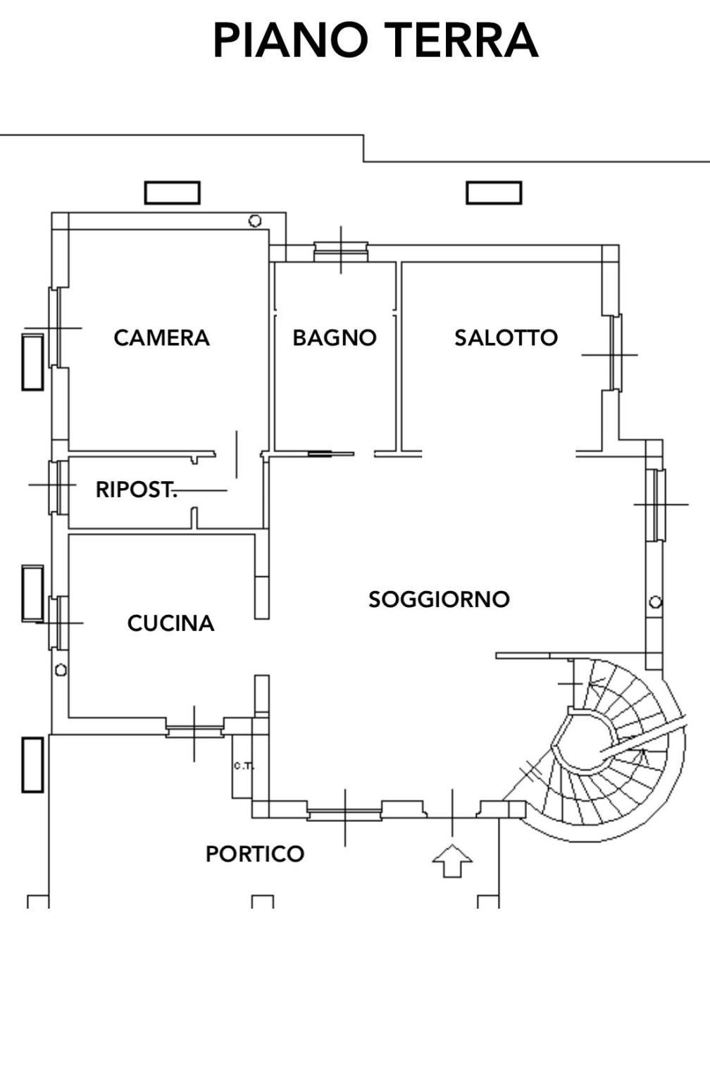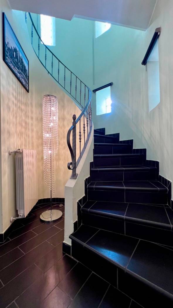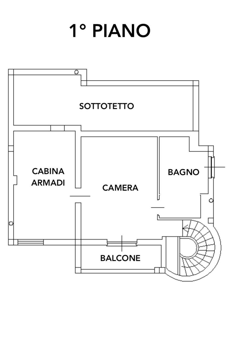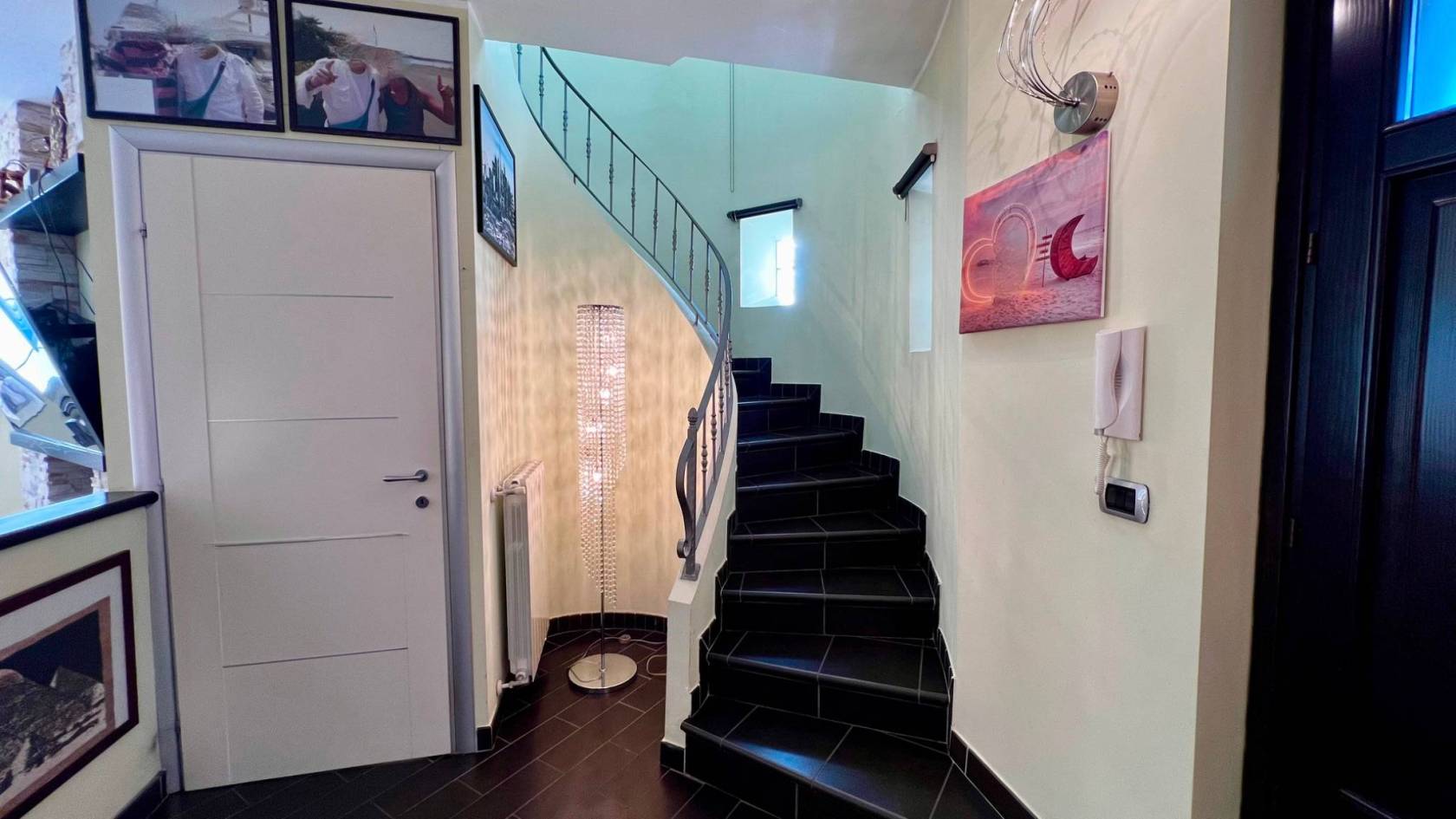 Dal soggiorno si accede al piano superiore tramite una scala a vista di forma rotonda, collocata all'interno della torretta della casa, un elemento architettonico distintivo che collega armoniosamente i piani.